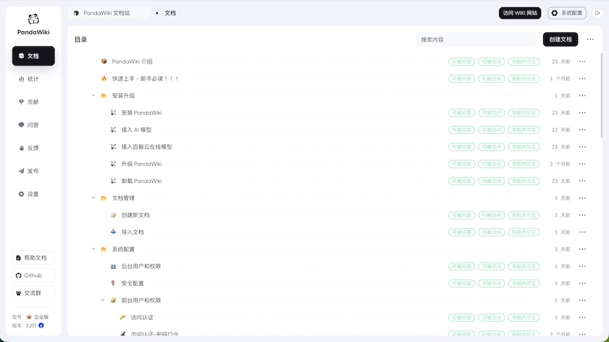 本文档介绍了PandaWiki的快速上手指南,包括安装步骤(需Docker 20.x以上Linux系统)、登录方法、创建知识库、配置AI大模型(推荐使用百智云模型广场)以及访问Wiki网站的流程。文档提供了详细的操作命令和图示,并附有相关参考链接和问题交流群二维码。