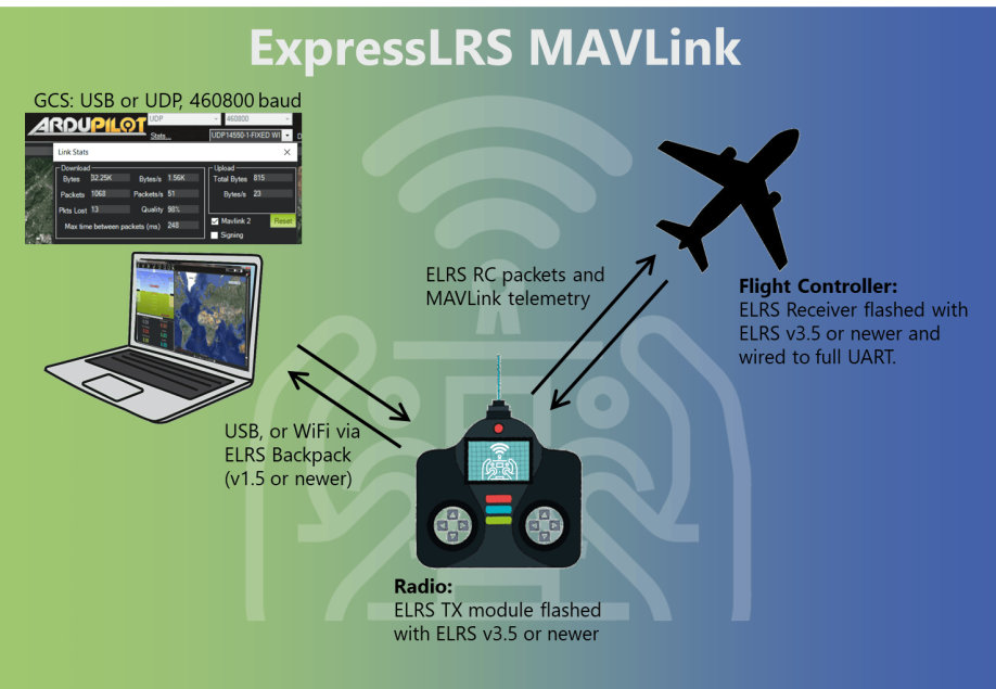 对于带有板载背包的 TX 模块,MAVLink 数据可以通过 WiFi 发送/接收到运行 GCS 软件的 PC 或平板电脑等。这为您的手机提供了无电缆解决方案,因为它消除了 TX 和 GCS 设备之间对 USB 电缆的需求。