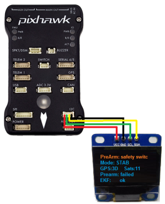 飞控系统(如 PX4 或 ArduPilot)可通过 I²C 接口连接外部 OLED 显示屏,用于实时显示飞行状态、传感器数据等信息。配置过程涉及硬件连接和软件参数设置两部分。
