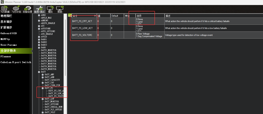 • BATT_FS_CRT_ACT = 0 (严重低压保护动作设为“无”)